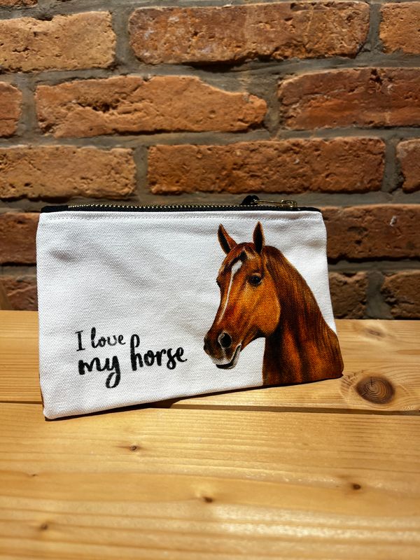 Perfekt zum Mitnehmen der Kekse des liebsten Vierbeiners. Eine Reißverschlusstasche mit einem hübschen Pferdegesicht und dem Schriftzug "I love my horse".